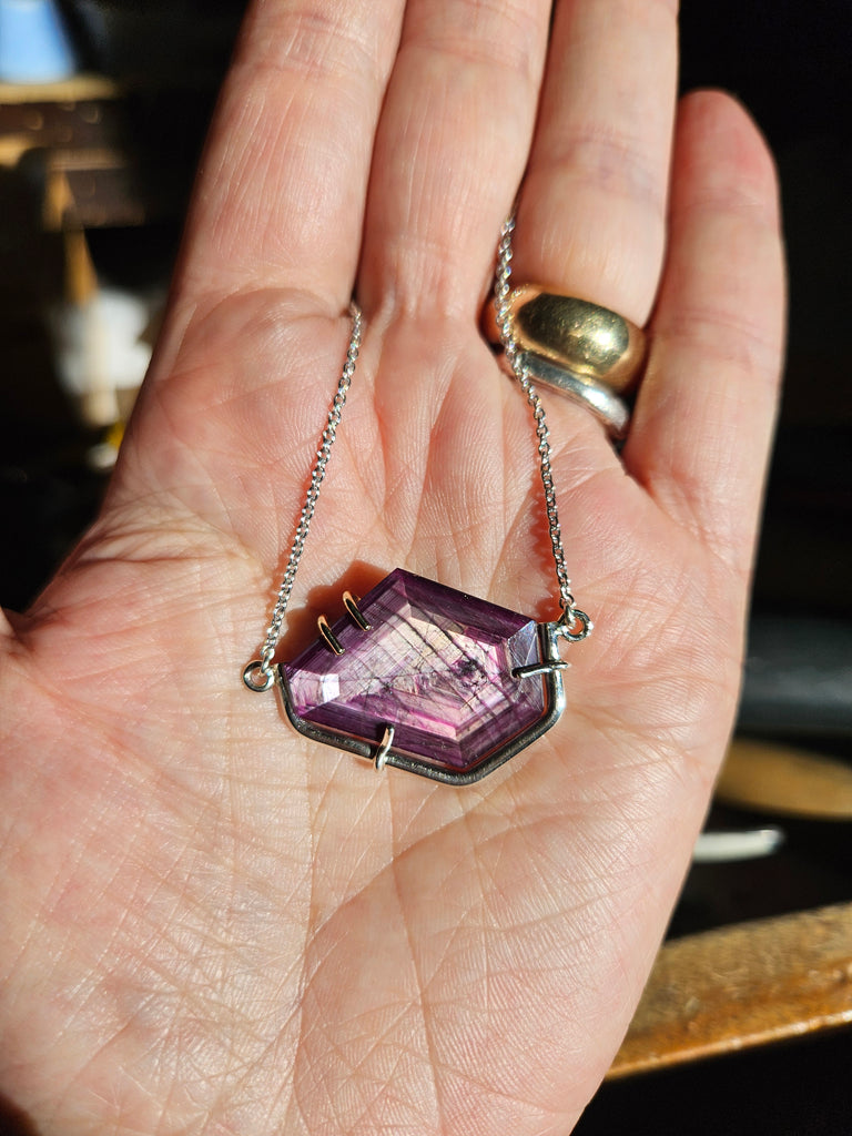 Hexagon Raspberry Sapphire in Sterling and 14k gold necklace