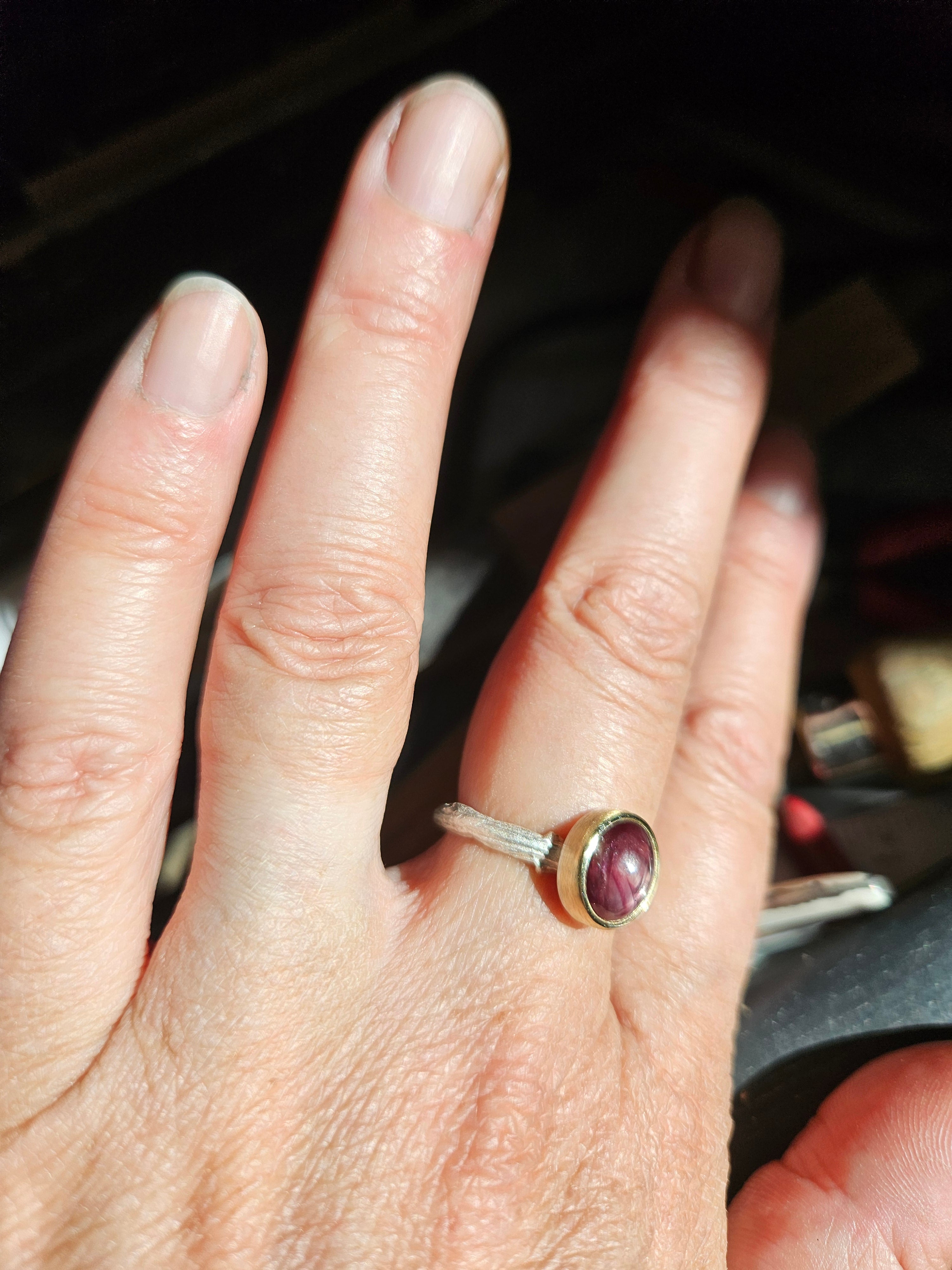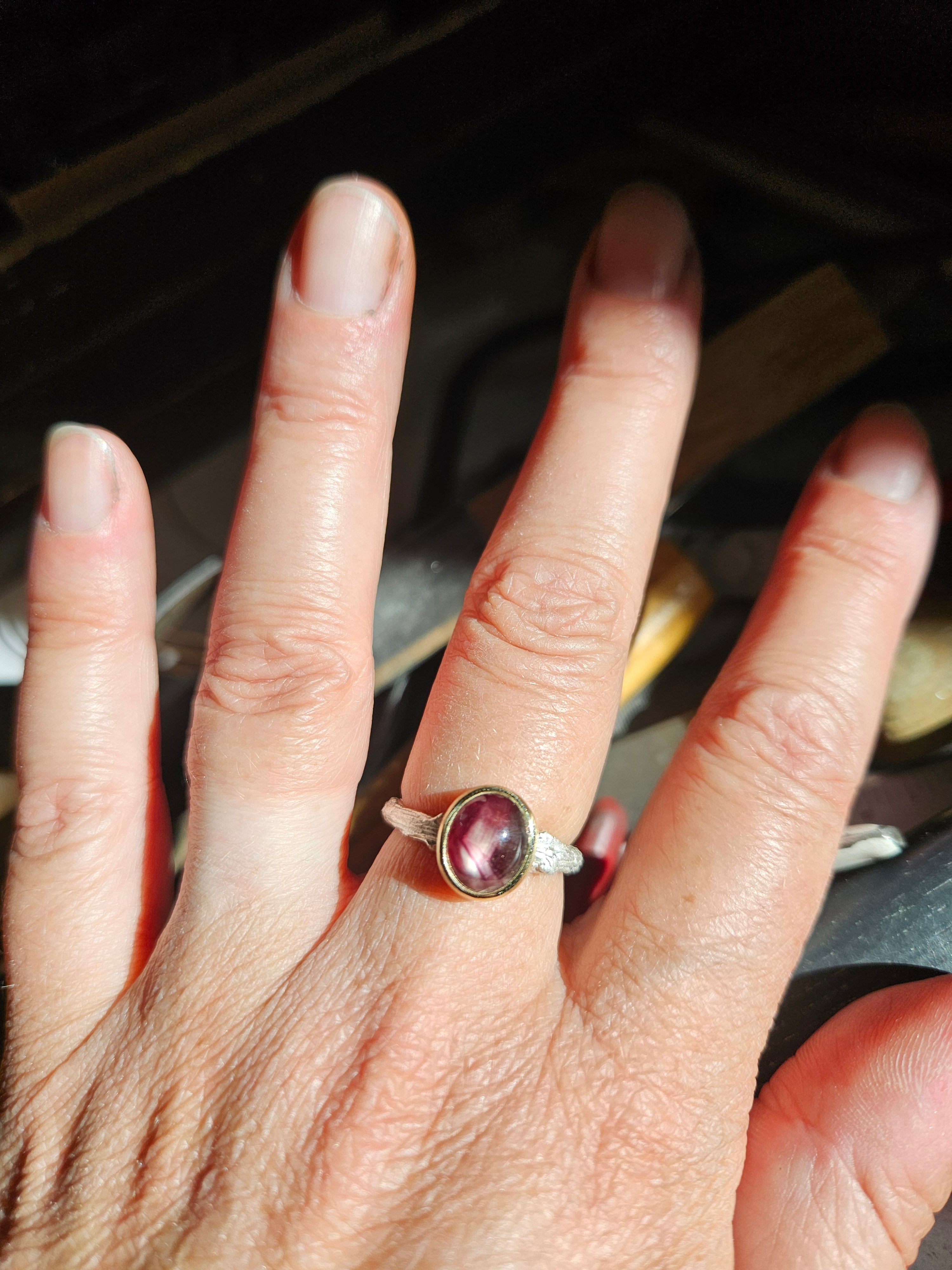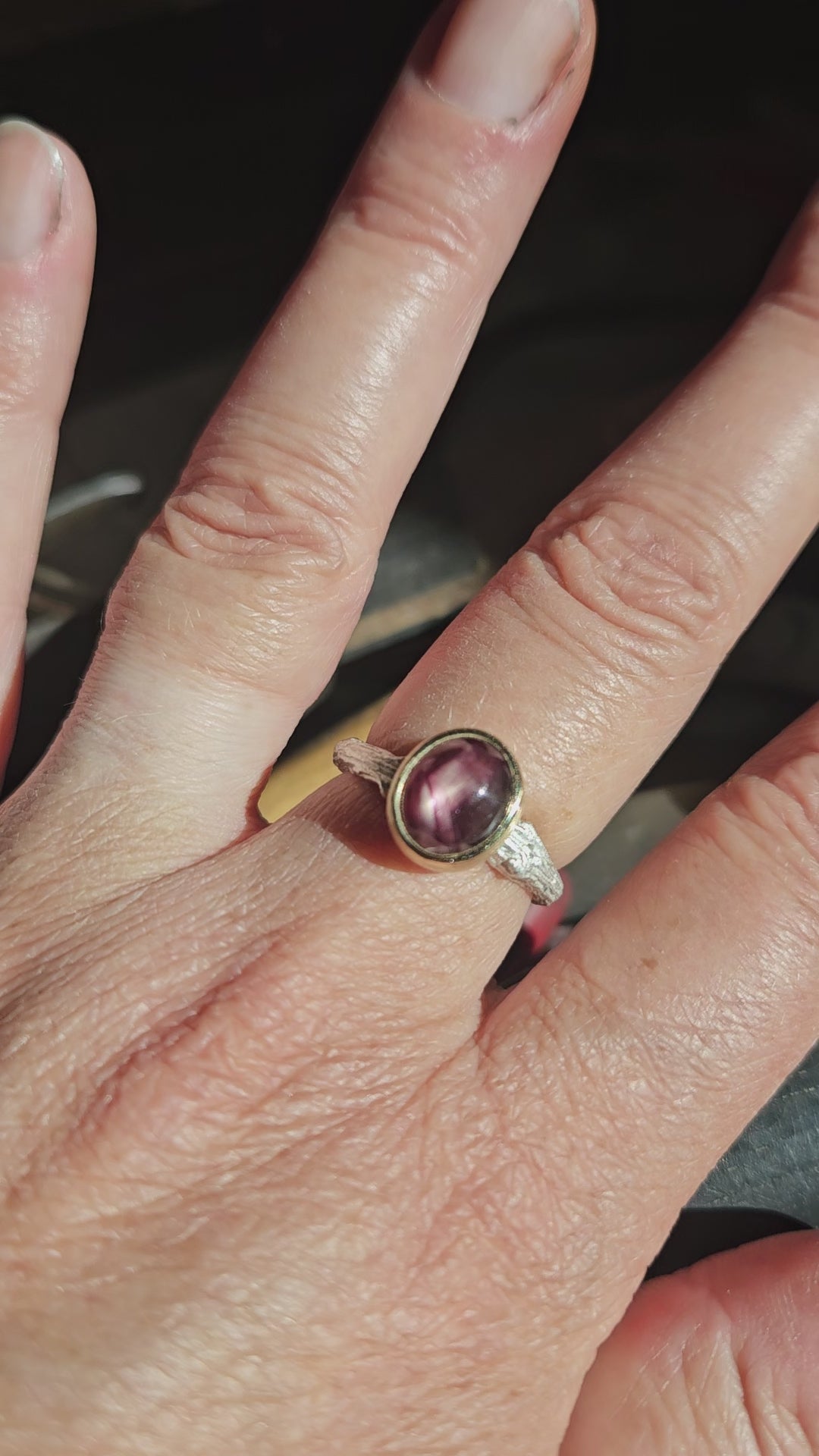 This beautiful Burgundy partial star Sapphire is smooth cut and is set in an 18k yellow gold (solid metal) bezel setting on a Sterling Silver big twig ring.