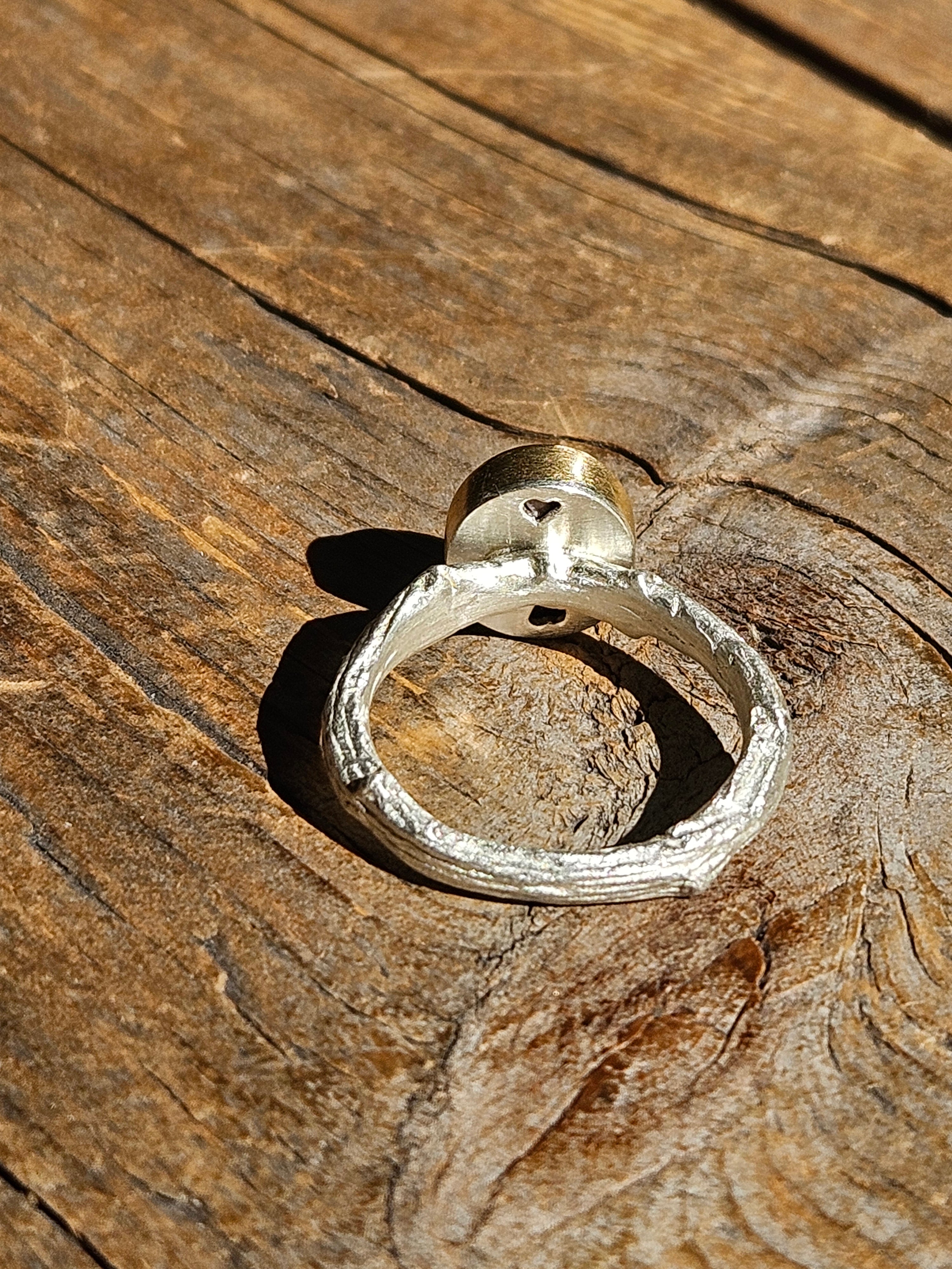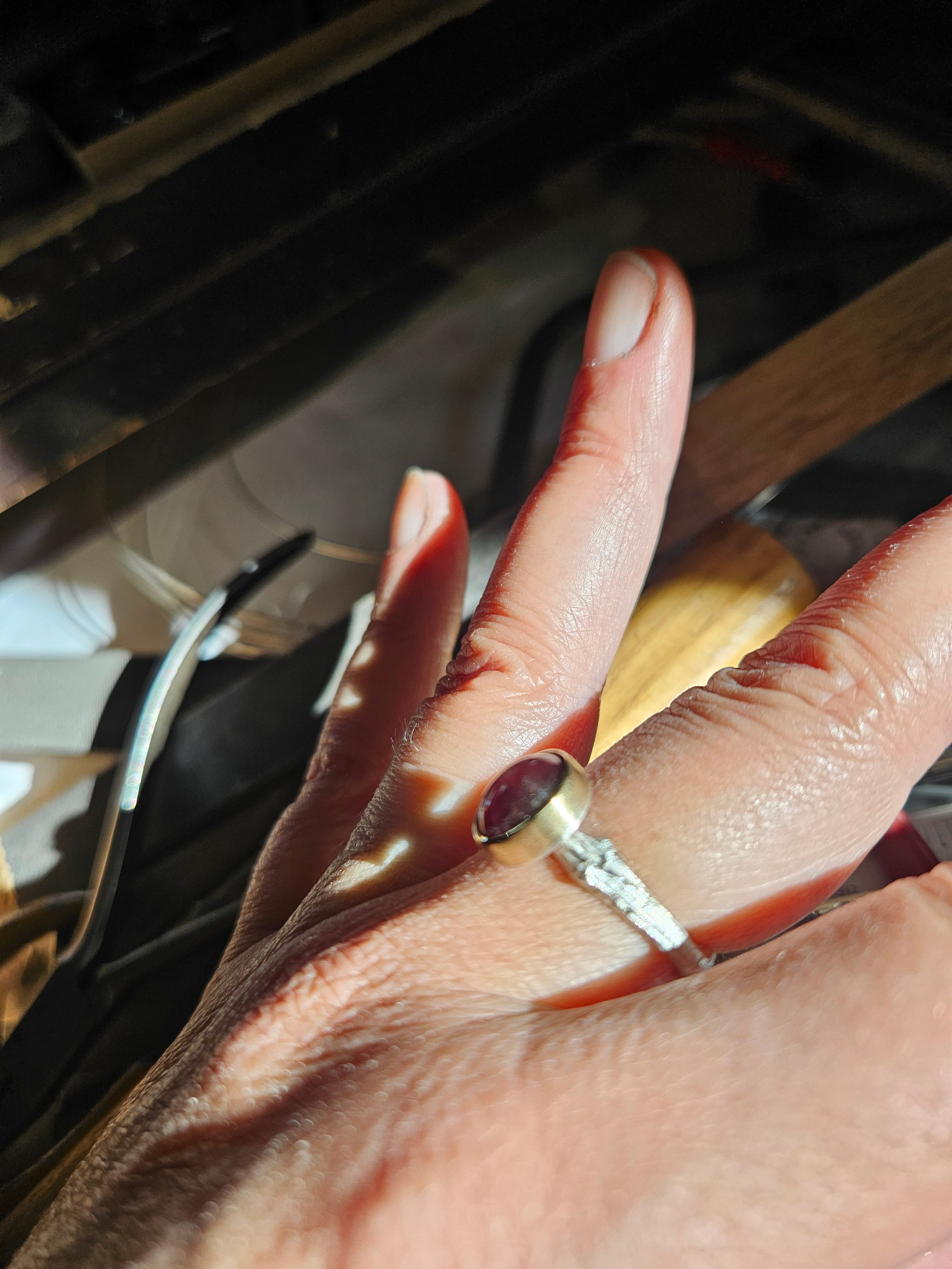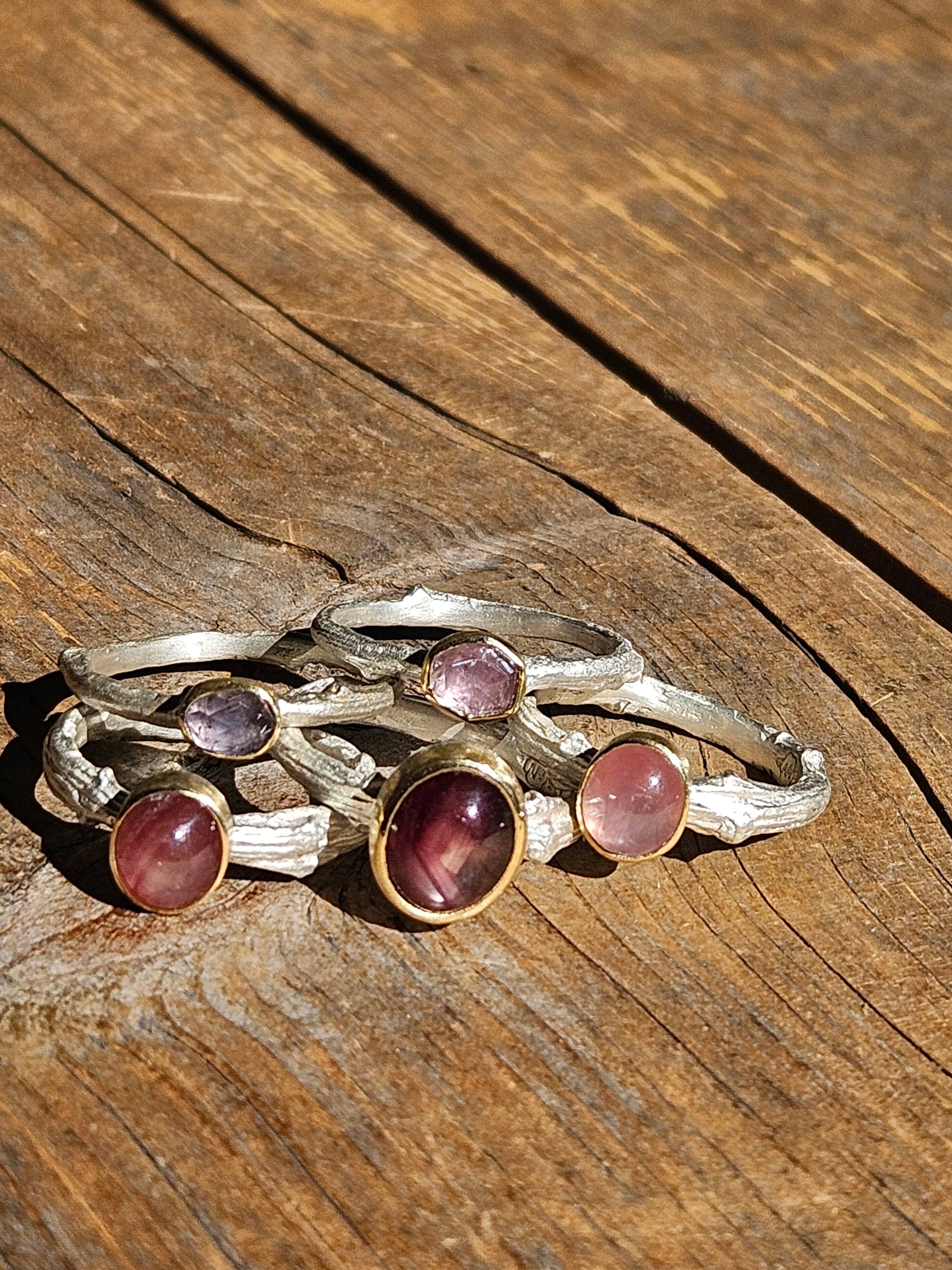 This beautiful Burgundy partial star Sapphire is smooth cut and is set in an 18k yellow gold (solid metal) bezel setting on a Sterling Silver big twig ring.